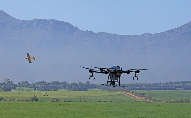 “For example, a recent insecticide trial on mature potatoes in the Northern Cape showed that the drone spraying at 30ℓ/ha achieved superior canopy penetration than that achieved by traditional tractor-boom application at 200ℓ/ha.”